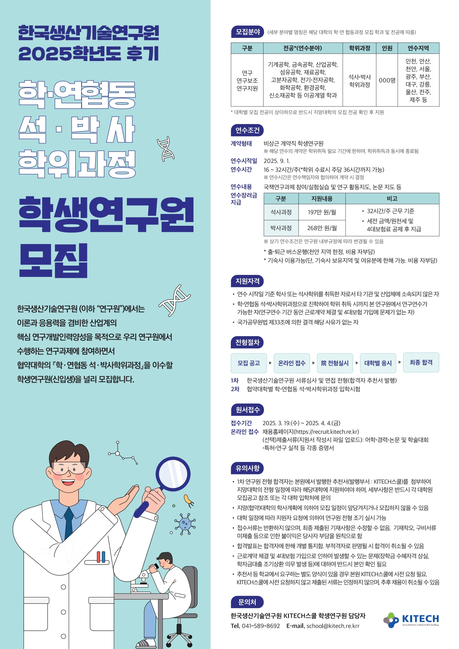한국생산기술연구원 2025학년도 후기 학·연협동 석·박사학위과정 학생연구원 모집 안내
