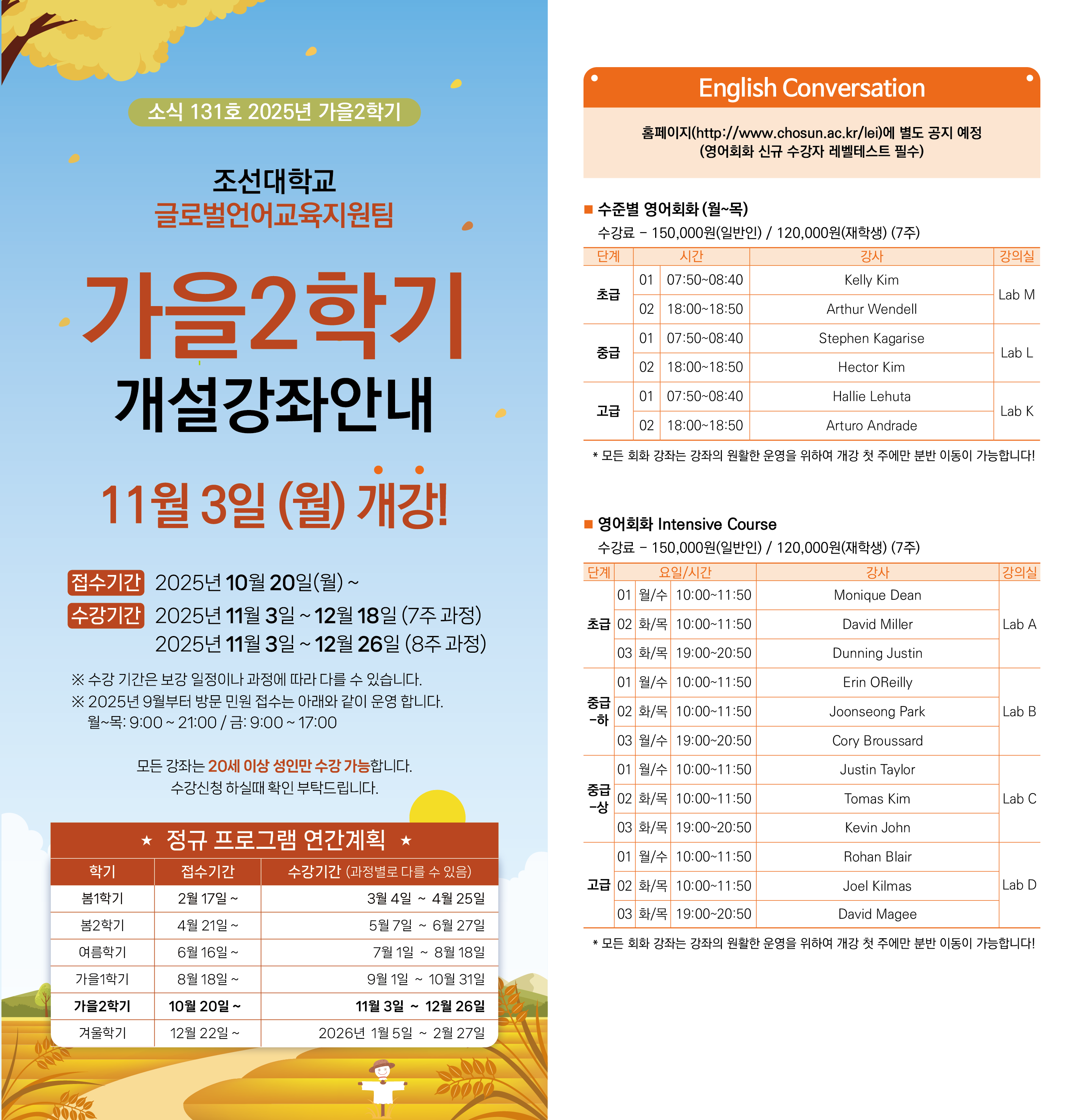 *영어회화 Intensive Course 고급 03분반 19:00 ~20:50 David Magee 화/목 -> 월/수 변경 되었습니다.