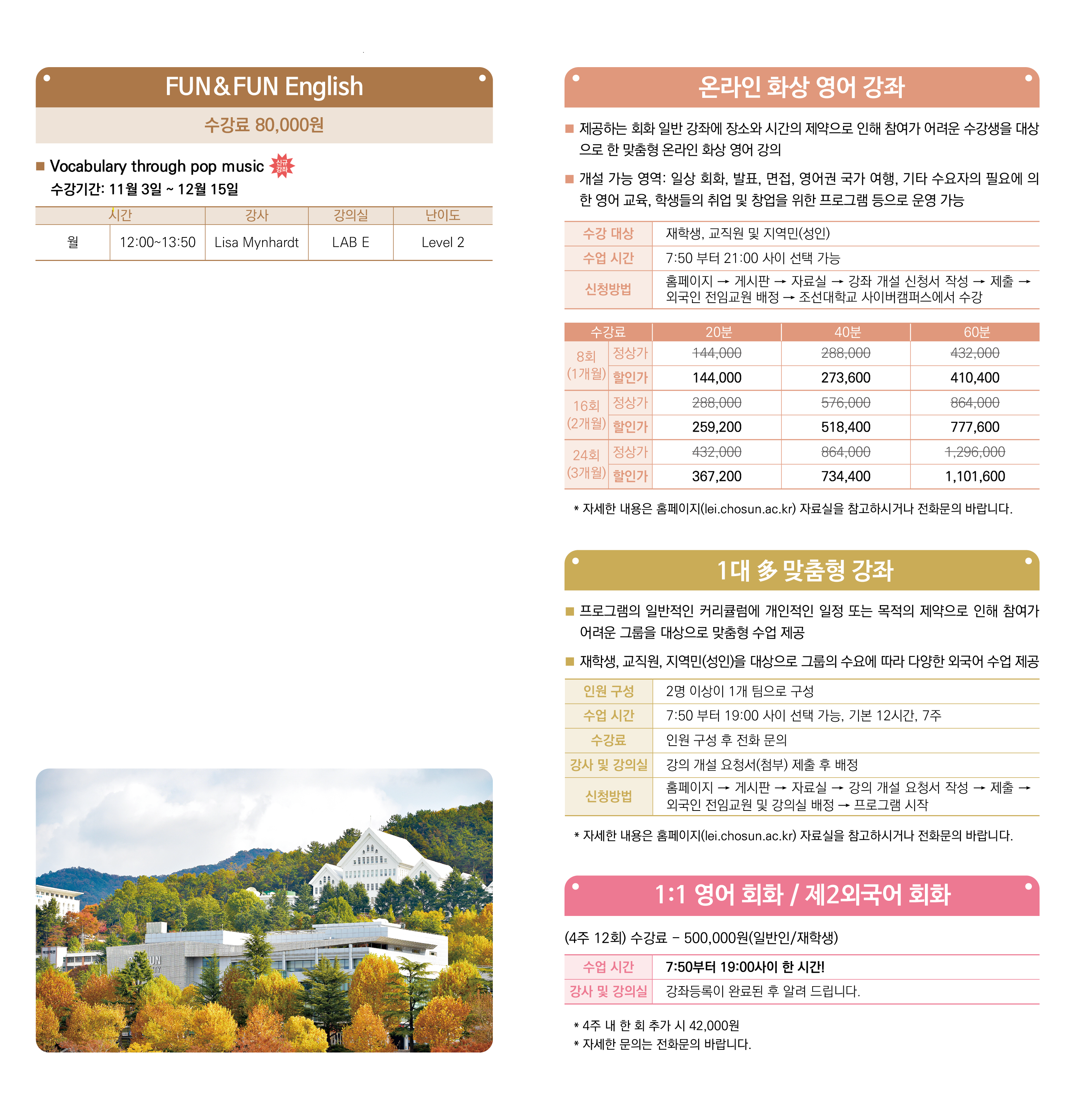 *Vocabulary through pop music 강의실 Lab E -> 2107강의실로 변경 되었습니다.