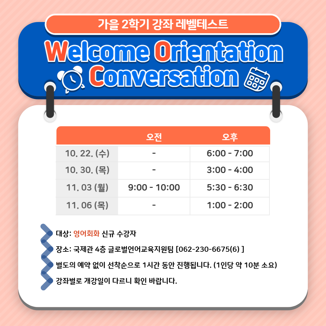 *신규 수강자분들께서는 레벨테스트 일정 참고하시어 사무실로 방문해주시면 안내 도와드리겠습니다.
