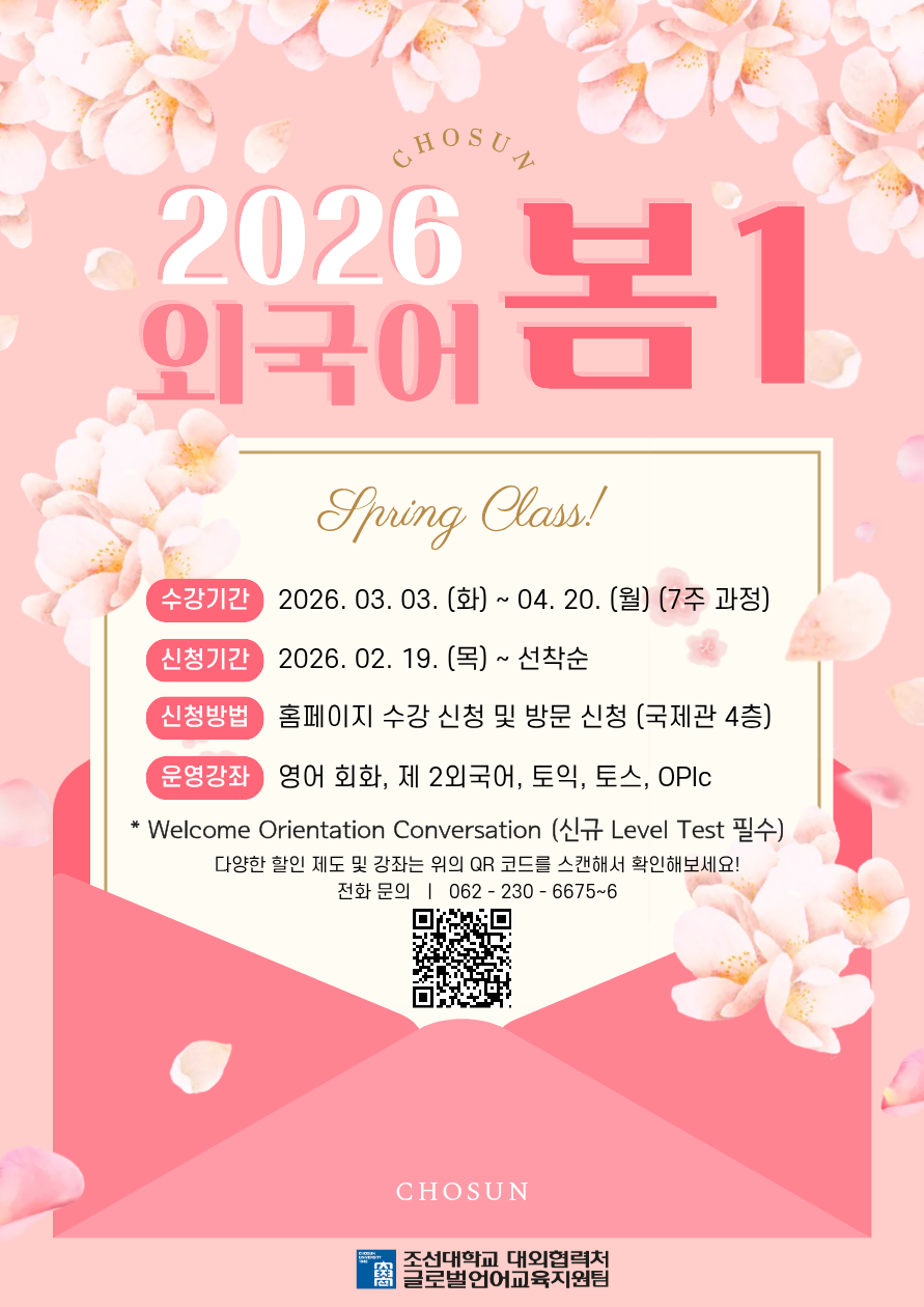 26학년도 봄1학기 외국어 강좌 개강(2월 19일부터 선착순 접수+레벨테스트 공지)